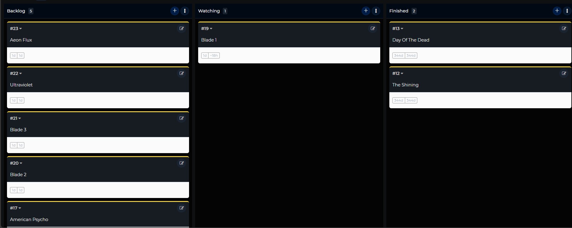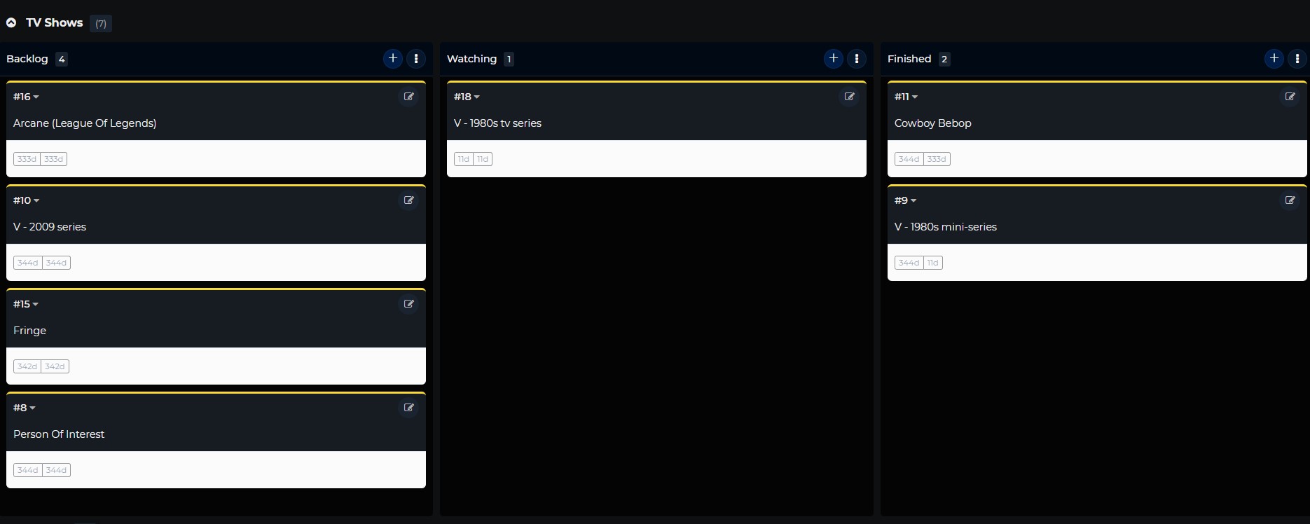 I've divided it into 3 columns (or "swimlanes" as Kanboard calls them) for my TV/movies: